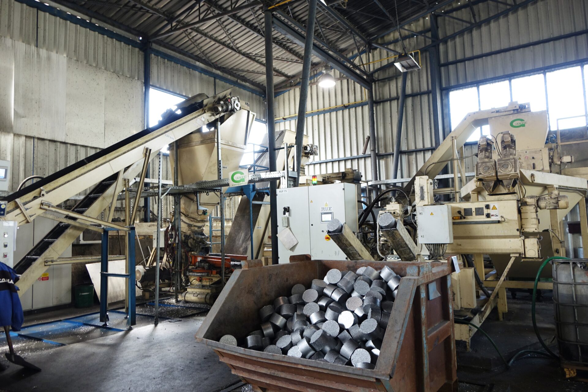 MT Comax acquired the first RUF Briquetting system RUF 75/2500/150, in 2014, which can press up to 1.5 tons of aluminium per hour. As the advent of available loose chips increased constantly, an expansion was necessary after three years. The manufacturer who should deliver the system was crystal clear this time around, and therefore the company invested in a further system, the RUF 90/2500/150 in 2017, with a capacity of up to two tons of aluminium per hour. The processing capacity of the complete chip preparation system lies somewhat lower than this, but the systems provided by RUF provide a total briquetting capacity of up to 3,5 t/hr .