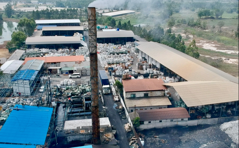 Drone view of Thai “dioxin factory” where circuit boards and wires are burned in a giant smelter. Toxic smoke belches from the stack, while ash piles are visible in foreground, and imported electronic equipment seen in the background. Copyright BAN, February 2, 2018.