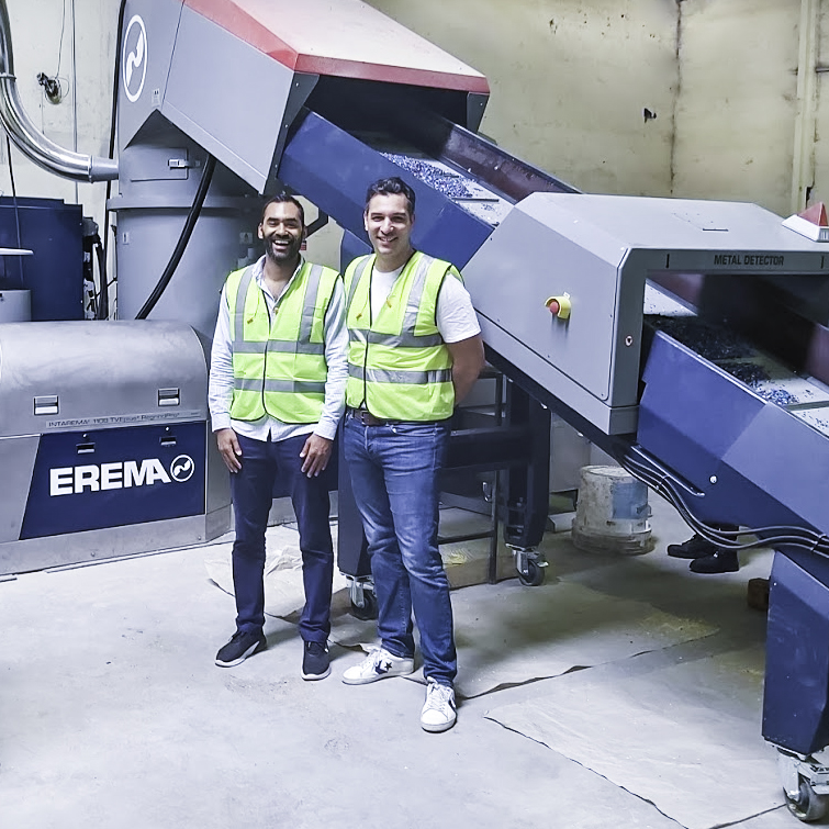 Keiran Smith and Karim Debabe in front of the brand new Intarema 1108 TVEplus RegrindPro made by Erema. The machine processes up to 500 kg/h of HDPE and up to 600 kg/h of PP plastic from household waste to produce recycled pellets.