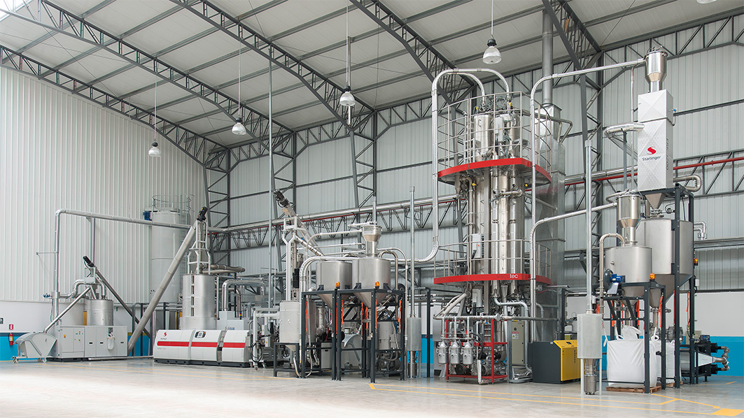 A Starlinger recoSTAR PET recycling line for food-grade rPET pellets.