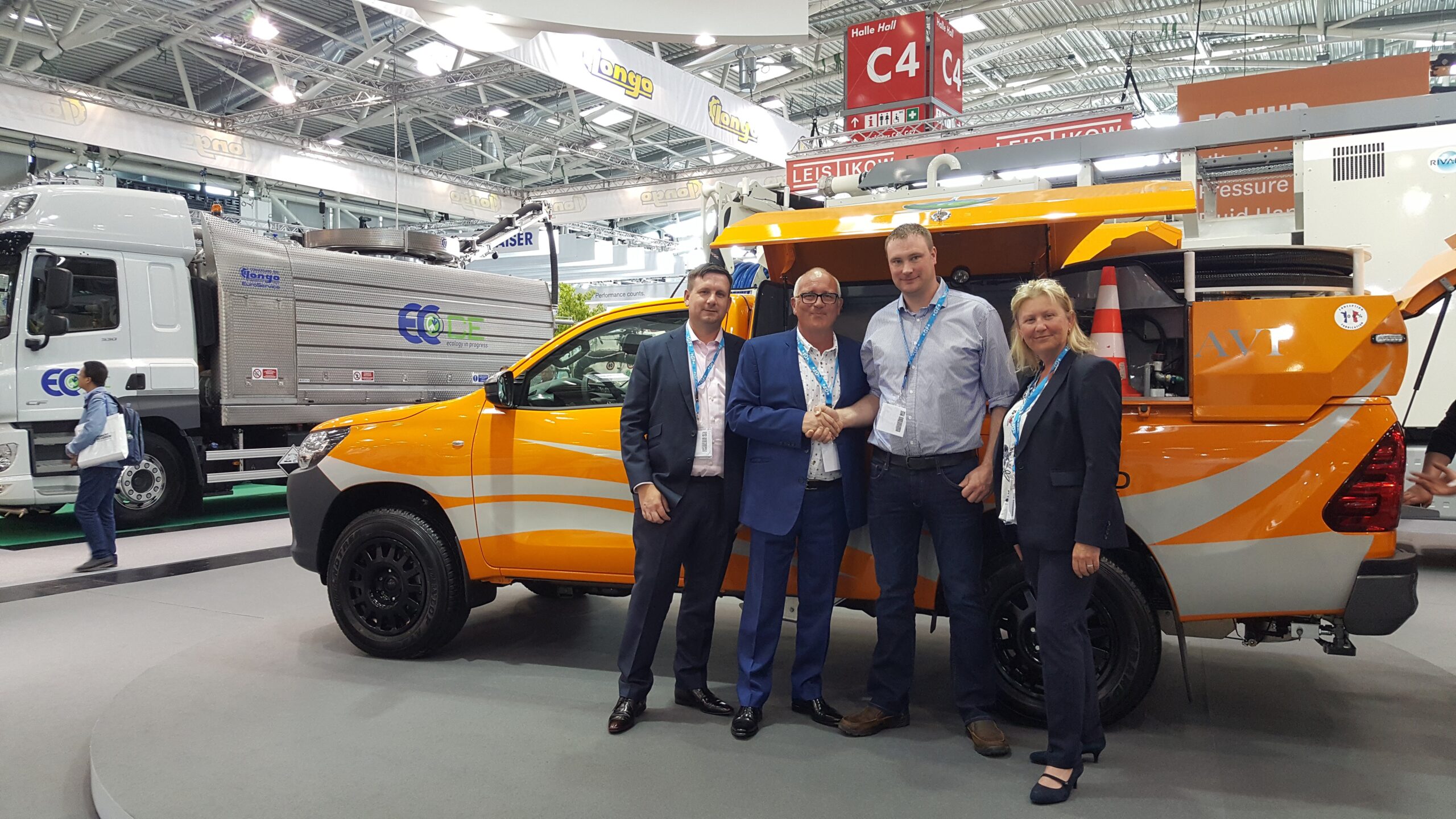 Celebrating CountyClean Group’s innovative equipment investment deal at iFAT on 15th May 2018 with a hearty handshake in front of Rivard’s BORA combination unit showpiece.
