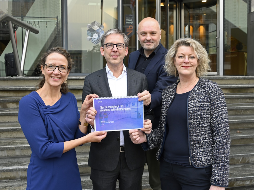 The final report was presented to VNO-NCW on November 30, 2023. Nienke Homan (president, VNCI), Focco Vijselaar (president, VNO-NCW), Boris van der Ham (president, DWMA), Drea Berghorst (managing director, Plastics Europe) with the report ‘Plastic feedstock for recycling in the Netherlands’. Copyright: Fotopersburo Dijkstra / Paul Dijkstra