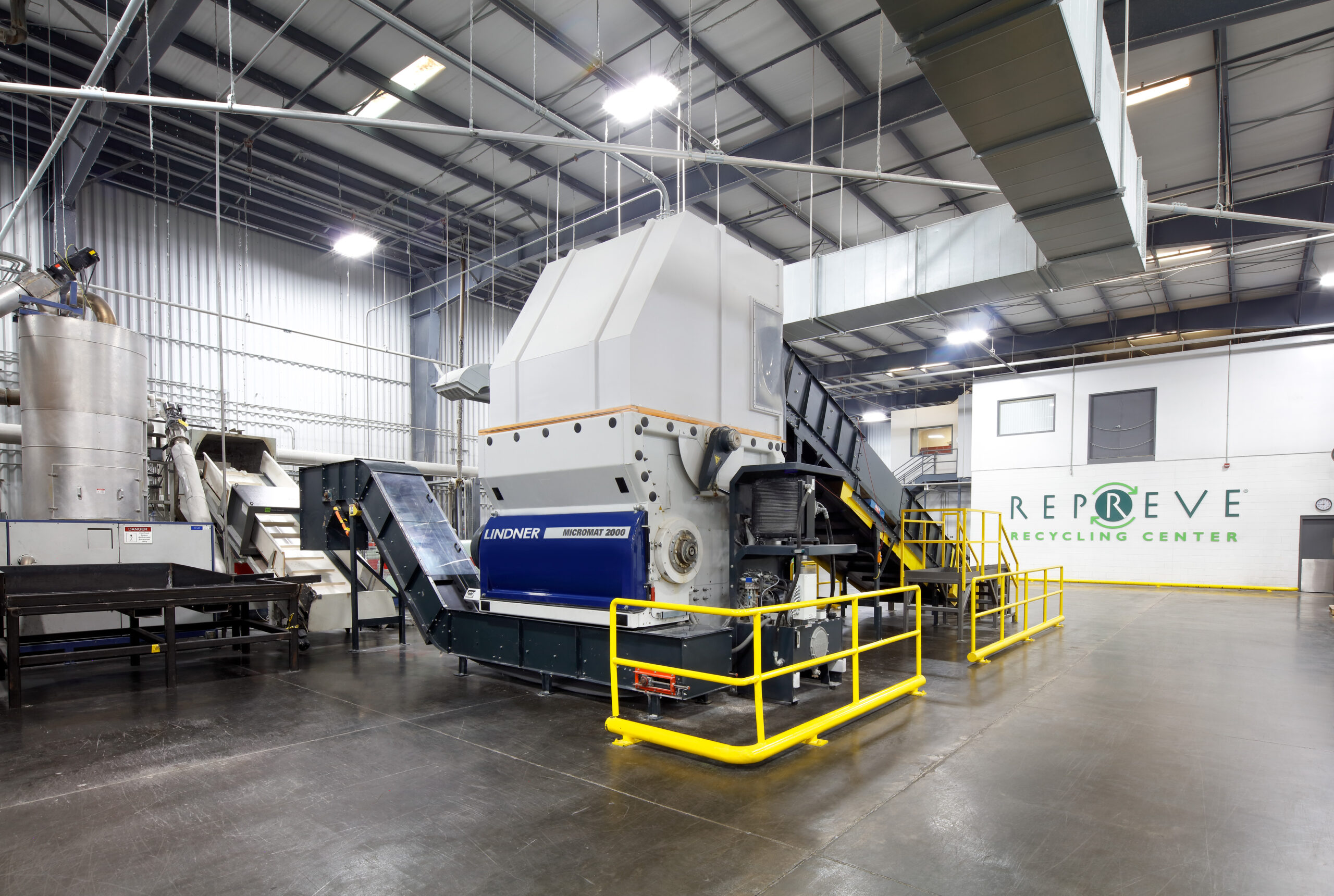 At Unifi three Lindner Micromat 2000 work 24/7/365 to prepare plastics and textile waste for its journey to extrusion, spinning and finally winding the fibers. Copyright: Lindner Recyclingtech