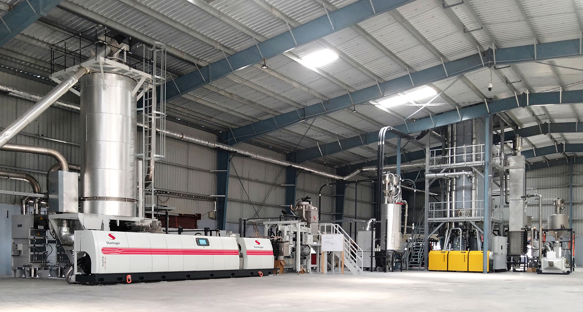 The Starlinger Recostar PET 165 iV+ PET bottle-to-bottle recycling line at Srichakra’s production facility in Telangana produces the rPET for Coca-Cola’s 1l Kinley water bottles. Copyright: Starlinger