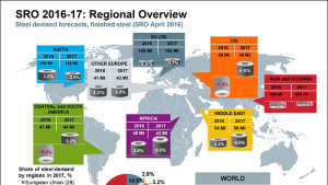 The World Steel Association (worldsteel) forecasts that global steel demand will decrease by -0.8% to 1,488 Mt in 2016 following a contraction of -3.0% in 2015. In 2017, it is forecast that world steel demand will return to growth of 0.4% and will reach 1,494 Mt.